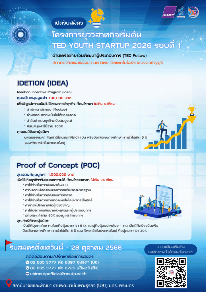 สถาบันวิจัยและพัฒนา งานพัฒนาบ่มเพาะธุรกิจ ขอเชิญชวนเข้าร่วมโครงการยุววิสาหกิจเริ่มต้น TED YOUTH STARTUP 2026 รอบที่ 1