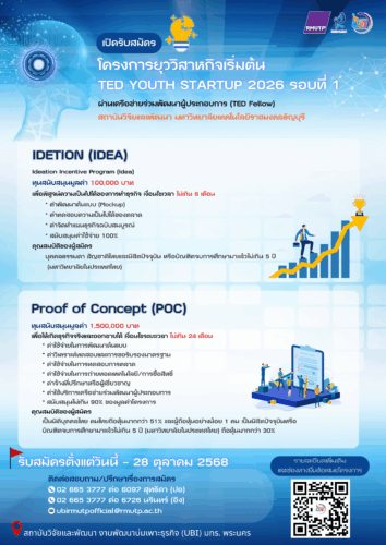 สถาบันวิจัยและพัฒนา งานพัฒนาบ่มเพาะธุรกิจ ขอเชิญเข้าร่วมกิจกรรม โครงการยุววิสาหกิจเริ่มต้น TED YOUTH STARTUP 2026 รอบที่ 1 ผ่านเครือข่ายร่วมพัฒนาผู้ประกอบการ (TED Fellow) สถาบันวิจัยและพัฒนา มหาวิทยาลัยเทคโนโลยีราชมงคลธัญบุรี