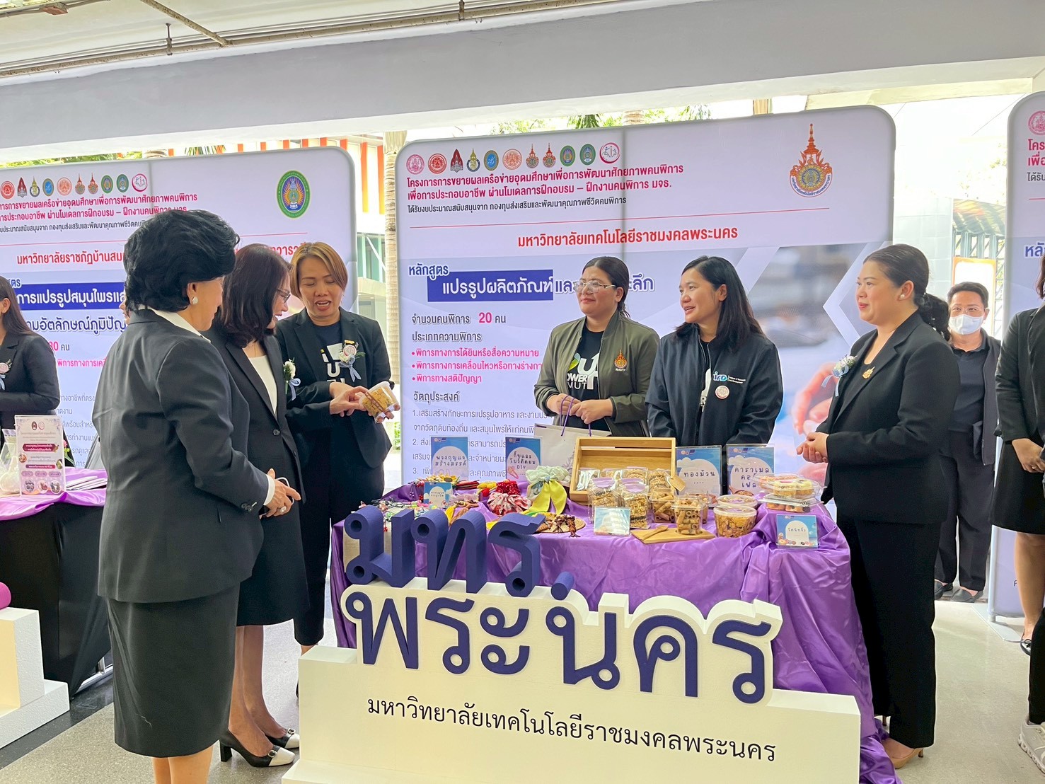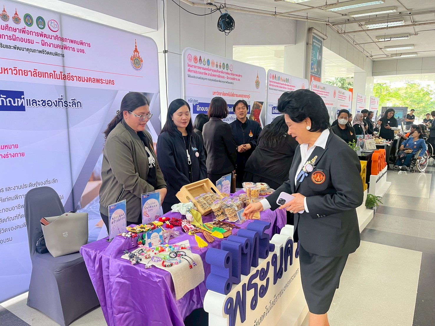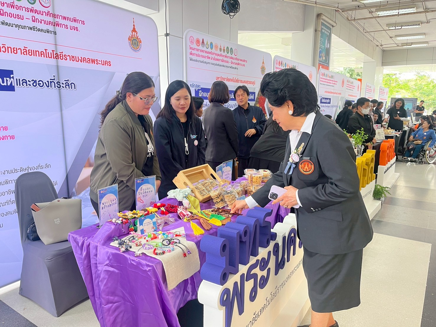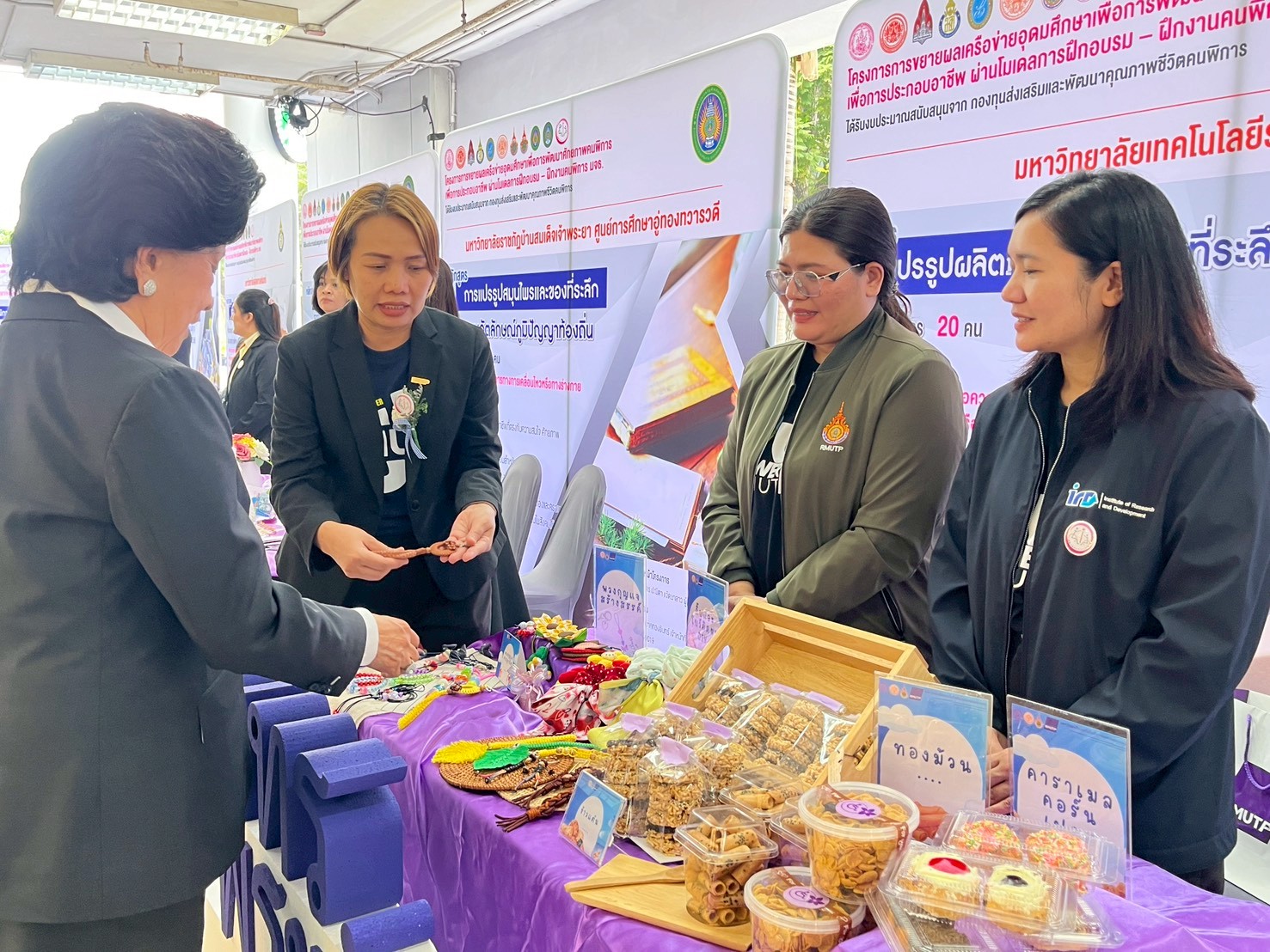 🟣สถาบันวิจัยและพัฒนา มหาวิทยาลัยเทคโนโลยีราชมงคลพระนคร ได้จัดบูธแสดงผลงานต้นแบบผลิตภัณฑ์ในการพัฒนาศักยภาพคนพิการประกอบด้วย โดนัทจิ๋ว ข้าวแต๋น ทองม้วน คาราเมลคอร์นเฟลก พวงกุญแจจากลูกปัด พวงกุญแจสร้างสรรค์ กิ๊บและโบว์ติดผม DIY