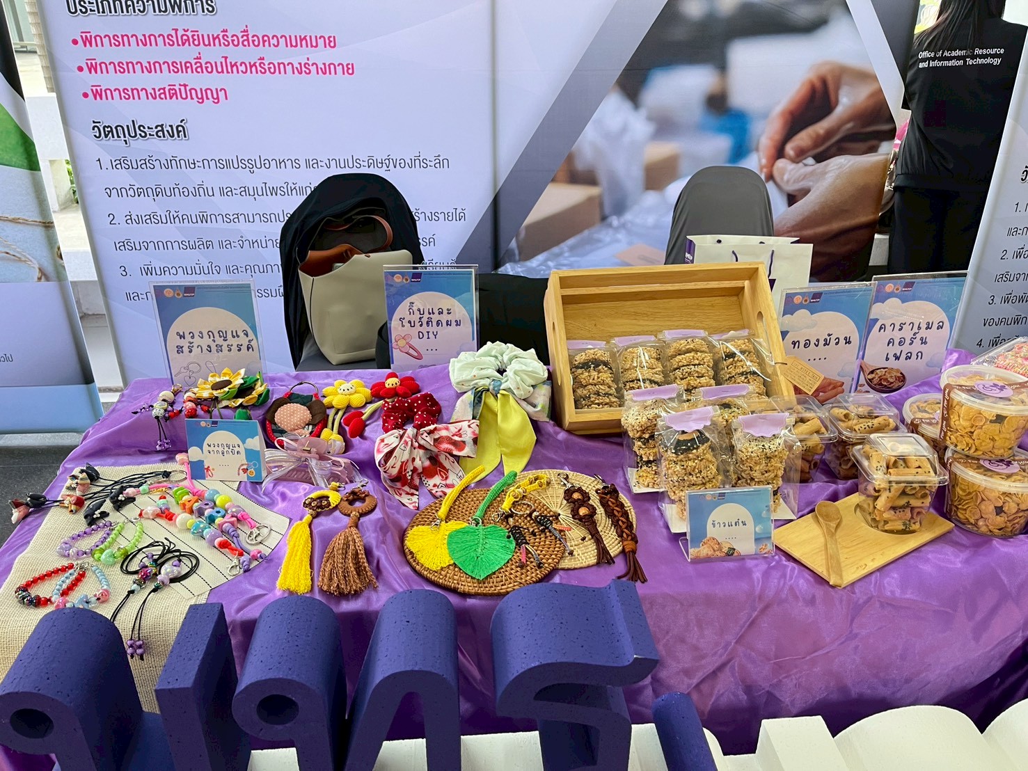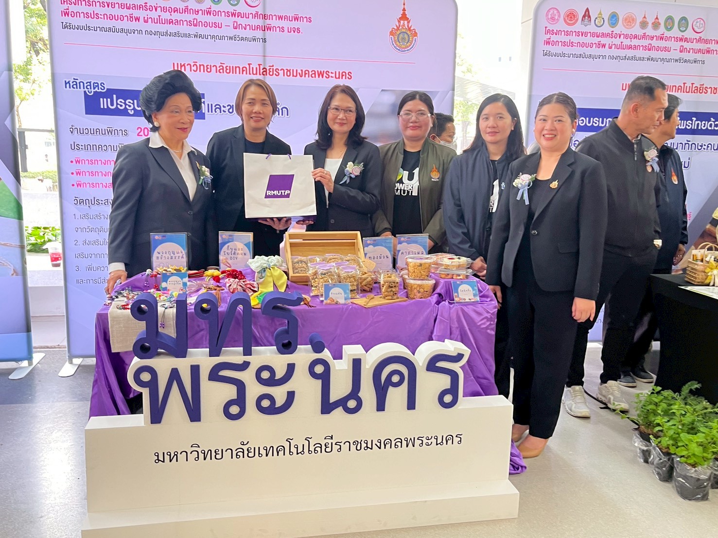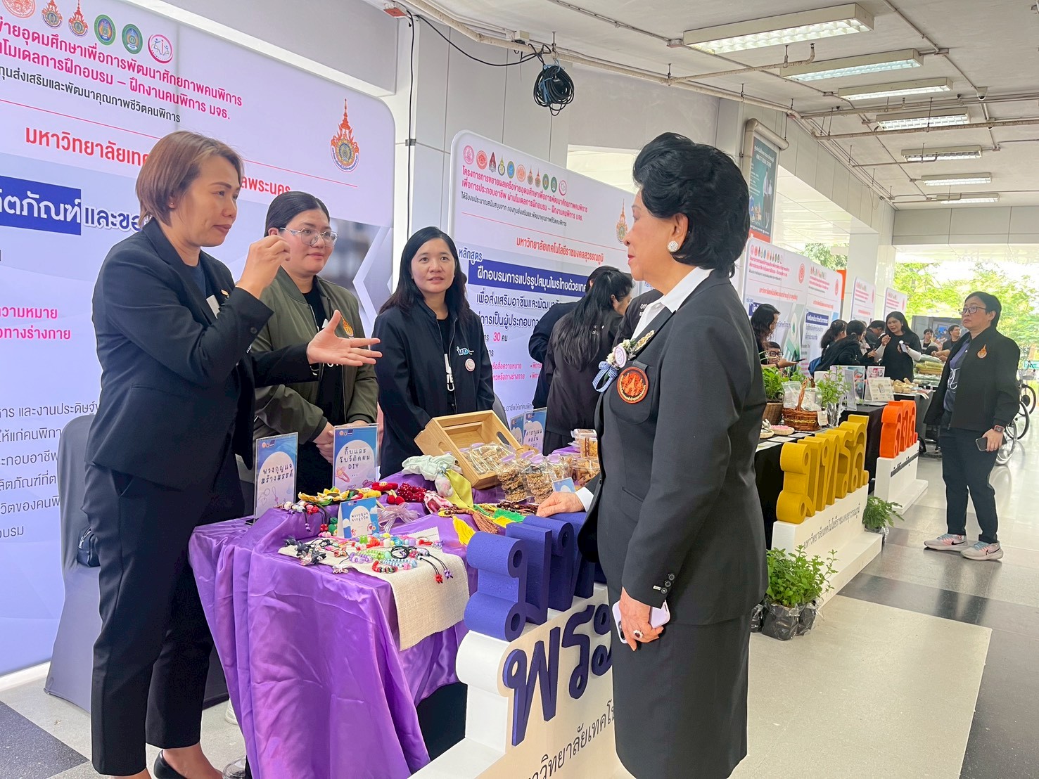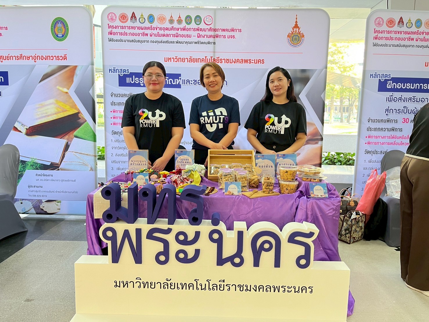 🟣สถาบันวิจัยและพัฒนา มหาวิทยาลัยเทคโนโลยีราชมงคลพระนคร ได้จัดบูธแสดงผลงานต้นแบบผลิตภัณฑ์ในการพัฒนาศักยภาพคนพิการประกอบด้วย โดนัทจิ๋ว ข้าวแต๋น ทองม้วน คาราเมลคอร์นเฟลก พวงกุญแจจากลูกปัด พวงกุญแจสร้างสรรค์ กิ๊บและโบว์ติดผม DIY