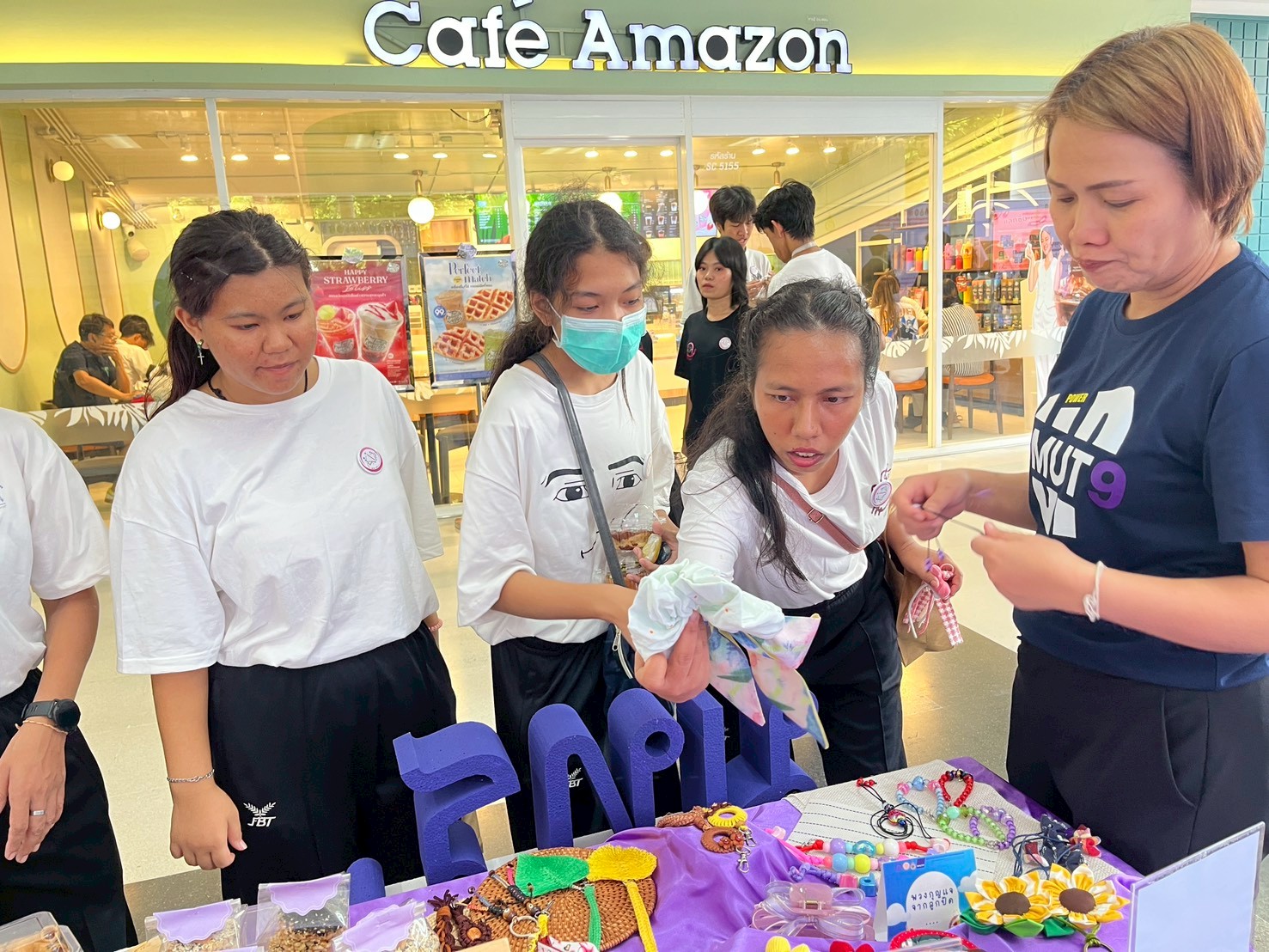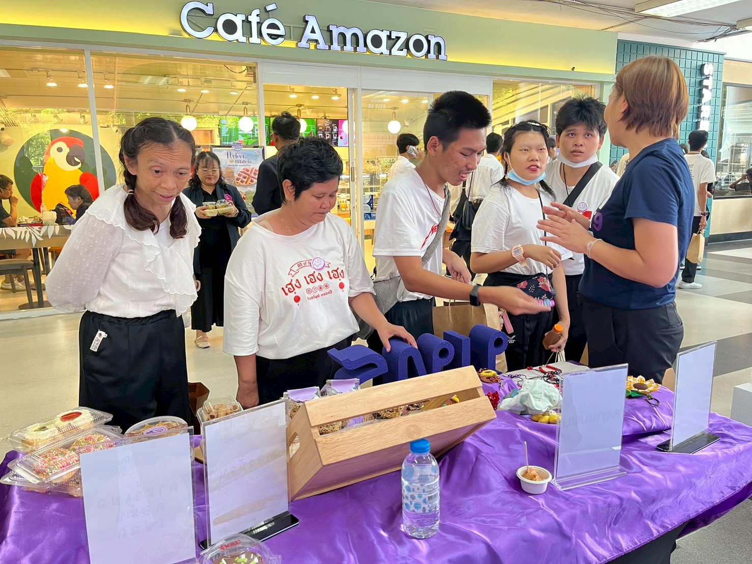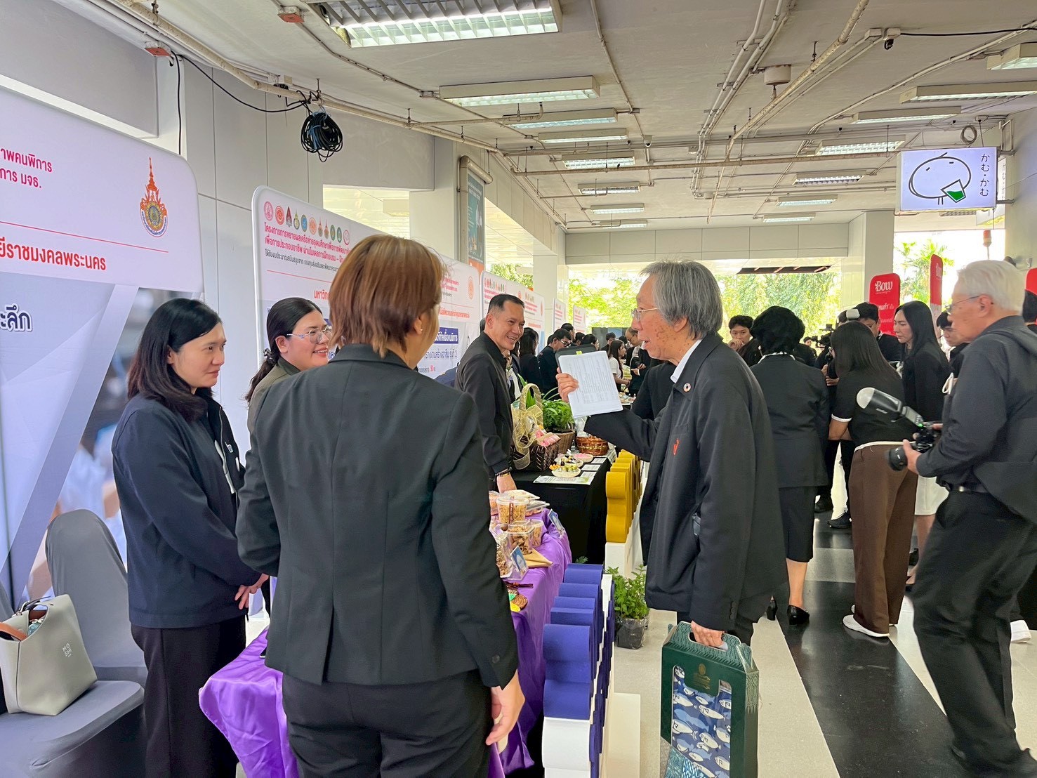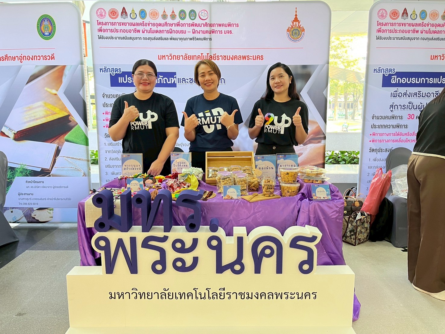 🟣สถาบันวิจัยและพัฒนา มหาวิทยาลัยเทคโนโลยีราชมงคลพระนคร ได้จัดบูธแสดงผลงานต้นแบบผลิตภัณฑ์ในการพัฒนาศักยภาพคนพิการประกอบด้วย โดนัทจิ๋ว ข้าวแต๋น ทองม้วน คาราเมลคอร์นเฟลก พวงกุญแจจากลูกปัด พวงกุญแจสร้างสรรค์ กิ๊บและโบว์ติดผม DIY