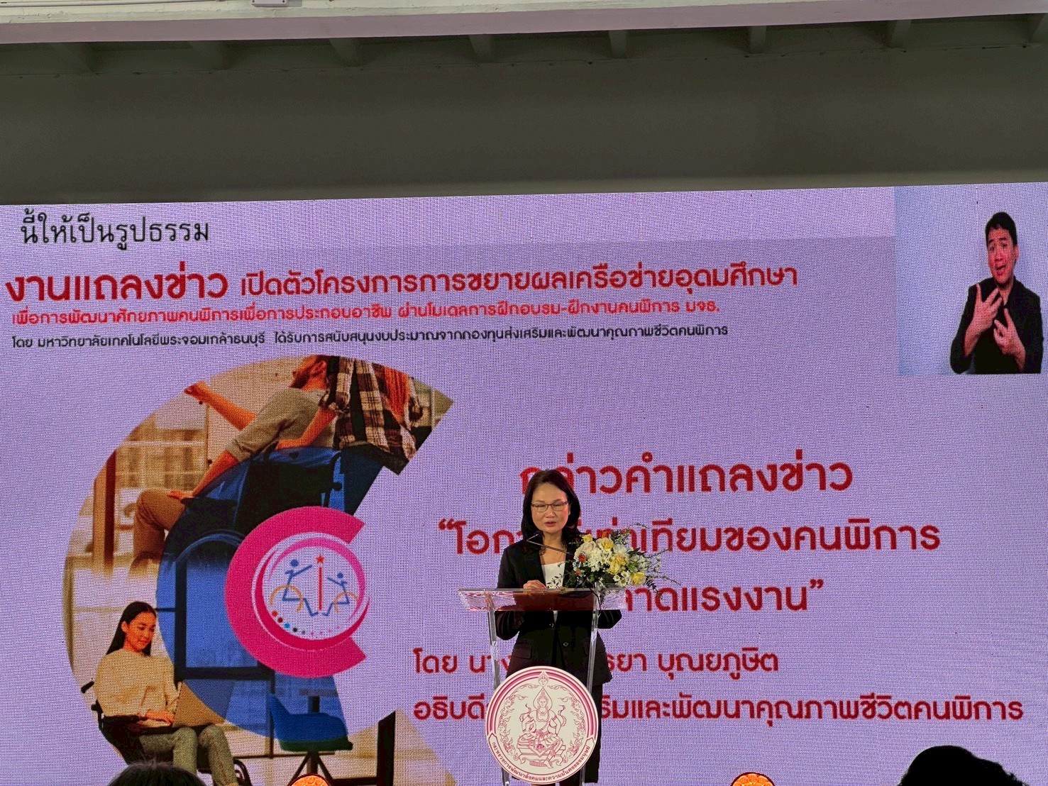 5. กล่าวคำแถลงข่าวในหัวข้อ “โอกาสที่เท่าเทียมของคนพิการในตลาดแรงงาน” โดย นางสาวสนธยา บุณยภูษิต อธิบดีกรมส่งเสริมและพัฒนาคุณภาพชีวิตคนพิการ