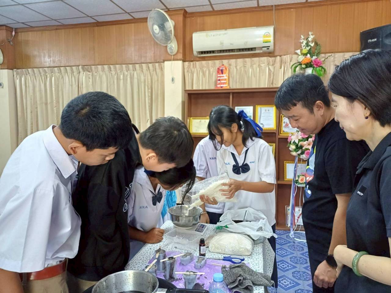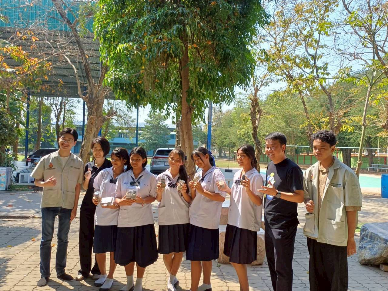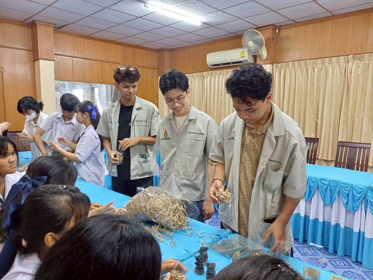 ลงพื้นที่บรรยายและฝึกปฏิบัติ หลักสูตร การพัฒนาผลิตภัณฑ์/ของตกแต่งร้านกาแฟ โดยใช้ประโยชน์จากกากกาแฟเหลือทิ้งแก่นักเรียนและครูในโรงเรียนบ้านหนองกะโดน จังหวัดนครปฐม นอกจากนี้ ยังมีการประชาสัมพันธ์มหาวิทยาลัย โดยนักศึกษาคณะสถาปัตยกรรมศาสตร์และการออกแบบ ราชมงคลพระนคร เล่าประสบการณ์และแนะแนวการเข้าศึกษาต่อให้กับน้อง ๆ นักเรียนระดับชั้นมัธยมศึกษา โดยได้แนะนำภาพรวมการเรียนการสอนของคณะสถาปัตยกรรมศาสตร์ ซึ่งมุ่งเน้นการเรียนรู้จากการลงมือปฏิบัติจริง ให้นักเรียนได้เห็นแนวทางการนำวัสดุเหลือใช้มาสร้างเป็นผลิตภัณฑ์ที่มีมูลค่า รวมถึงการต่อยอดความรู้สู่การประกอบอาชีพและการทำธุรกิจด้านออกแบบในอนาคต